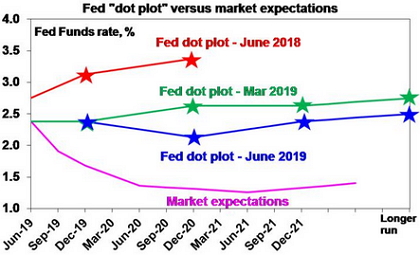 The US Federal Reserve at its June meeting has clearly shifted in a very dovish direction strongly hinting at interest rate cuts ahead. It downgraded its economic activity assessment from “solid” to “moderate”, it noted falling inflation expectations, it dropped the reference to being “patient” in raising rates, it noted that uncertainties have risen, it lowered its inflation forecasts to below the 2% target and it said it will “closely monitor” the economy, which is often code for moving to easing. While its dot plot of Fed officials’ interest rate expectations still sees rates on hold this year, it’s now line ball with 8 out of 17 officials now seeing a cut of which 7 see two cuts and many of those who have rates on hold see an increased case for a cut and it only requires one of those to shift for the dot plot to move to a cut this year. What’s more, the dot plot now sees a cut next year and it has lowered the long run rate to 2.5%. The dot plot is well down from a year ago when three rate hikes were indicated for this year and one for next year. Overall, absent a clear move towards resolution of trade issues and much better data the Fed looks on track for a cut in July and we continue to see two Fed rate cuts this year.