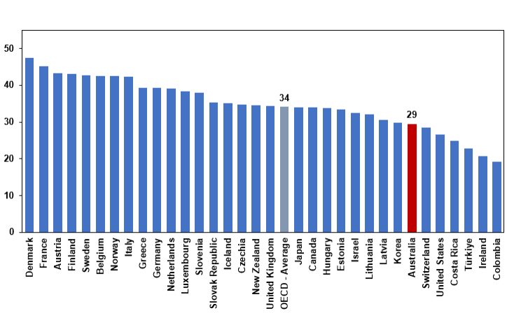 The good news is Australia is a relatively low tax country. Total tax revenue as a share of GDP at 29% in 2022 was at the low end of OECD countries.