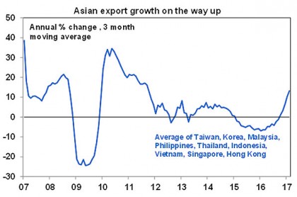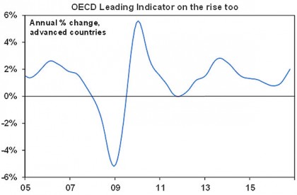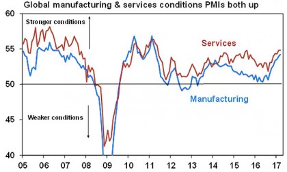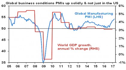 Despite numerous geopolitical threats (Eurozone elections, tensions between the US and China, North Korea, etc.), worries about the demise of the so-called “Trump trade” and shares being overbought and due for a correction at the start of the year, share markets have proved to be remarkably resilient with only a minor pull back into their recent lows. This despite a more significant fall back in bond yields. Partly this is because the geopolitical threats have not proven to be major problems (at least so far) and Trump remains focussed on his pro-business policy agenda (he has already embarked on deregulation and his tax reform proposals – while lacking in details – indicate that tax reform remains a key objective). More fundamentally though, markets have been underpinned by an improvement in global growth. This is likely to continue.