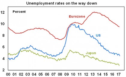 Consistent with improving global economic conditions, measures of unemployment are heading down in the major advanced countries (albeit they still have further to go in Europe).