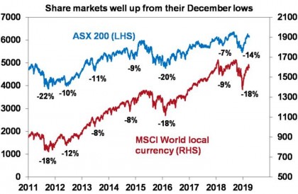But first some perspective. At their lows back in December global shares had fallen 18% from their highs with US shares down 20% and Australian shares down 14% and many were convinced that recession was around the corner. Since then share markets have staged an impressive rebound with global shares rising 18%, US shares up 21% and Australian shares up 14%. So the 2% or so fall in shares seen in the past few days is a bit of a non-event.