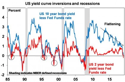Share markets are due a correction or pullback after rallying strongly since their December lows and worries about inverted yields curves and the growth outlook could provide the trigger. But US and global recession still looks to be a fair way off and we continue to see this being a reasonably good year for shares. The continuing fall in bond yields is not necessarily inconsistent with rising share markets (in 2016 shares bottomed in February and bond yields didn’t bottom till July/August!) but it does highlight that the post GFC environment of constrained growth and inflation and low rates remains alive and well.