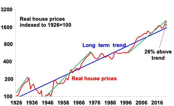 The boom over the last 25 years has seen real property prices rise from about 23% below their very long-term trend to 26% above. It has been largely driven by the shift to low interest rates and a surge in population relative to housing supply.