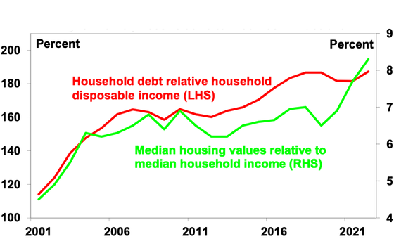 The rise in household debt has gone hand in hand with higher home prices relative to incomes in Australia