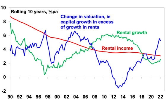 Looked at from a purely investment perspective, lower inflation drove lower interest rates which in turn pushed up home prices relative to rents leading to a collapse in property rental yields – just as bond yields and yields on shares fell over the last few decades into their recent lows as inflation fell. The gross rental housing yield has fallen from over 8% in the early 1980s to a recent low of around 2.2%. The next chart breaks down the contribution to rolling gross 10-year housing property returns in Australia from rents (ie, the gross rental yield) and capital growth “due to” rental growth and changes in valuations (ie, the rise in prices relative to rents). Of course, this is a rough guide only as it assumes that rents from rental property are a good guide to the underlying services owner-occupied property provides. But it indicates that the decline in rental yields since the 1980s on the back of lower inflation and interest rates has boosted house prices by around 3% pa, or around 45% of the total increase in house prices. In other words, if inflation hadn’t fallen, driving interest rates down, which in turn drove home prices up and rental yields down annual home price growth since the 1980s may have been up to 3% pa lower.