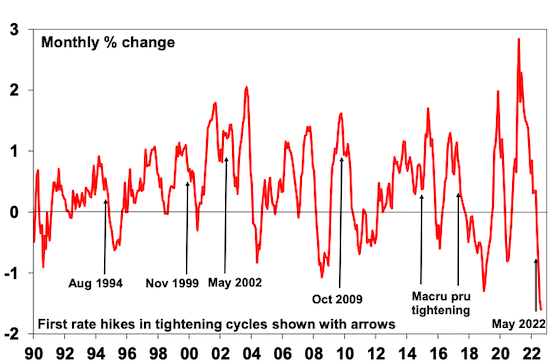 Rising mortgage rates are the main driver and there is likely more to go. We continue to expect a 15-20% top to bottom fall in home prices out to the second half of next year, followed by a gradual recovery.