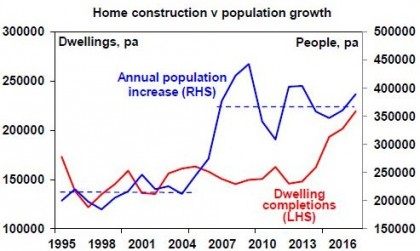Yes, there is a risk of a house price collapse but it’s a lot more complicated than most people think as pointed out in my last house price note http://bit.ly/2y97kCE . Basically: we have not built enough housing to keep up with strong population growth since mid-last decade (see the next chart); the boom lately has been confined to Sydney and Melbourne (which were more harmed than helped by the mining/China-related boom); and the deterioration in lending standards has been modest with, for example, little in the way of the NINJA (no income, no jobs, no assets) loans that caused so much trouble in the US.