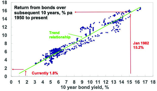 When bond yields are high, they set up high bond returns over the medium term and vice versa. For example, Australian 10-year bond yields in January 1982 were 15.2% and it’s not surprising that bond returns over the next 10 years were 15.4%. Right now, they’re just 1.8%, pointing to pretty low bond returns.