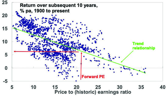 For shares a similar relationship holds. The following chart shows a scatter plot of the price to trailing 12 months earnings ratio for US shares since 1900 (along the horizontal axis) against subsequent 10-year total returns (ie, dividends plus capital growth) from US shares. While the relationship is not as smooth as that for bonds as there is much more involved in share returns, it can be seen that it is a negative relationship, ie, when share prices are relatively high compared to earnings, subsequent returns tend to be relatively low and vice versa. The best time for shares is after PEs have fallen to single digits.