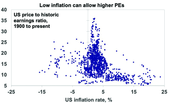 Finally, the appropriate level of valuation will vary with inflation and interest rates. In a period of low inflation, assets can trade on lower yields as the interest rate/yield structure in the economy falls. This means higher PEs. So low inflation, say down to around 2%, can be good for shares via higher PEs as seen in the next chart. But if inflation becomes deflation it can be bad as it tends to be associated with economic contraction.