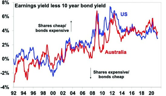 Shares – PE ratios for shares are relatively high particularly using earnings reported for over the last 12 months but less so when using forward earnings to adjust for currently depressed earnings from the pandemic. Allowing for still low bond yields – by subtracting 10-year bond yields from the earnings yields (using forward earnings) – shows that US and Australian shares still offer a decent risk premium over bonds of around 2.9% in the US and 3.8% in Australia. See the next chart. This may change if bond yields rise further. But at present shares continue to offer a decent return premium relative to bonds.