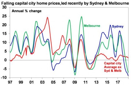 According to CoreLogic data, up until December capital city dwelling prices are down 7% from their September 2017 high. This masks a wide range though with Sydney down 11% from its July 2017 high, Melbourne down 7% from its November 2017 high, Perth down 16% and Darwin down 25% from their mid 2014 mining investment boom highs but other cities continuing to trend up to varying degrees. Recently the declines have been led by Sydney and Melbourne. House prices are on average down more than unit prices and prices in regional centres have generally held up better than capital cities.