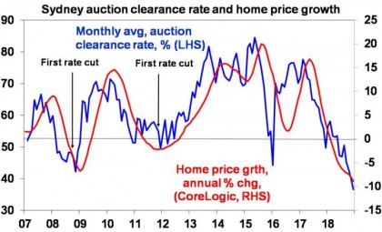 For Sydney and Melbourne our base case has been that prices would have a top to bottom fall of around 20% out to 2020. However, the further plunge in auction clearance rates and acceleration in price falls late last year suggest a deeper fall possibly of around 25% (although it’s impossible to be precise). This suggests around another 15% fall in Sydney and more in Melbourne. A 25% top to bottom drop would take prices back to where they were in late 2014/early 2015.