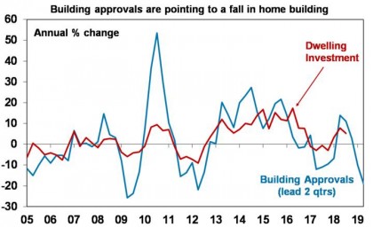 The housing downturn will affect the broader economy via slowing dwelling construction, negative wealth effects on consumer spending (ie, our wealth goes down, we feel poorer, we spend less than otherwise) and if rising defaults drive a further slowing in bank lending. The first two will detract 1 to 1.5 percentage points from economic growth. Growth in infrastructure spending and business investment should help keep the economy growing but its likely to be constrained to around 2.7% which in turn will keep wages and inflation low.