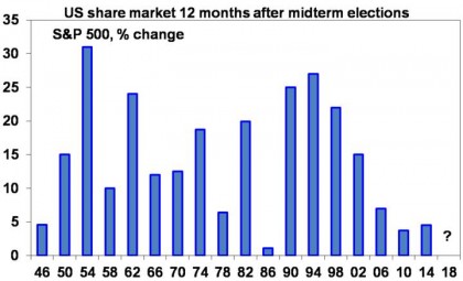 The US midterm elections saw the Democrats win control of the House and Republicans retain the Senate which was what had been indicated by the polls and betting markets. So, it provided no surprises – in contrast to Brexit and Trump’s 2016 win! While the Democrat House is likely to prevent Trump from cutting taxes any further it won’t be able wind back last year’s tax cuts, reverse Trump’s deregulation of the economy or change his trade policy. But there is some chance that Trump and the Democrats may agree on infrastructure spending. While the Democrat House will likely set up committees to investigate Trump and consider impeachment charges, it’s very unlikely to get the required 67 out of 100 senate votes to remove him from office unless he is shown to have done something really bad. All up, while there may be some skirmishes around shutdowns and debt ceilings, the midterm outcome could be positive because it means less policy uncertainty.