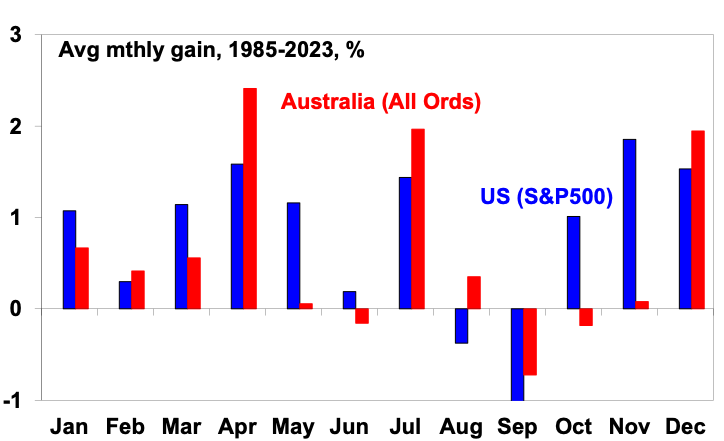 Seasonal patterns have long been observed in share markets. The “January effect” was perhaps the most famous, where January typically provided the best gains, but anticipation of it has seen it morph into December and now November. However, it’s really part of a broader seasonal pattern, which over long periods has been positive for shares from around October to around May and then weaker to September. This can partly be seen in the pattern of average monthly share prices changes since 1985 shown in the next chart.
