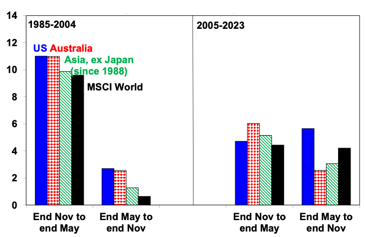 Or another way to look at it is to break a 12-month period into two halves. Since 1985, the average total return (from price gains and dividends) from US shares from the end of November to the end of May is nearly double that from the end of May to the end of November. Elsewhere the gap has been bigger.