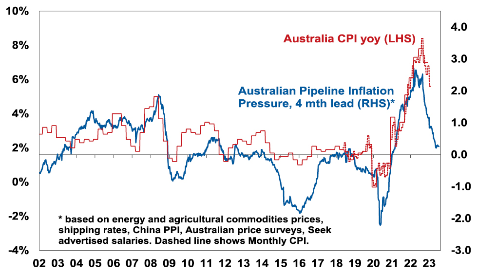 Australian inflation is lagging the US by 6 months, but our Australian Pipeline Inflation Indicator suggests inflation here will continue to fall. The RBA has started to soften its tightening bias & while we are allowing for a bit more on rates (given RBA worries about still high services inflation & the high risk of stronger wages growth), our assessment is that the RBA is either at or close to the top with rate cuts starting in February next year.