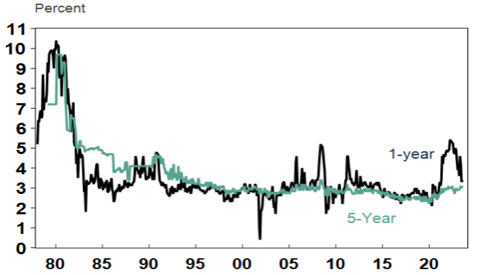 The 1970s experience tells us the longer inflation stays high, the more businesses, workers and consumers expect it to stay high and then they behave in ways which perpetuate it – in terms of wage claims, price setting and tolerance for price rises. The good news is that short term (1-3 years ahead) inflation expectations have fallen sharply & longer-term inflation expectations remain in the low range they have been in for the last three decades. This is very different from 1980 when inflation expectations were around 10% and deep recession was required to get inflation back down.