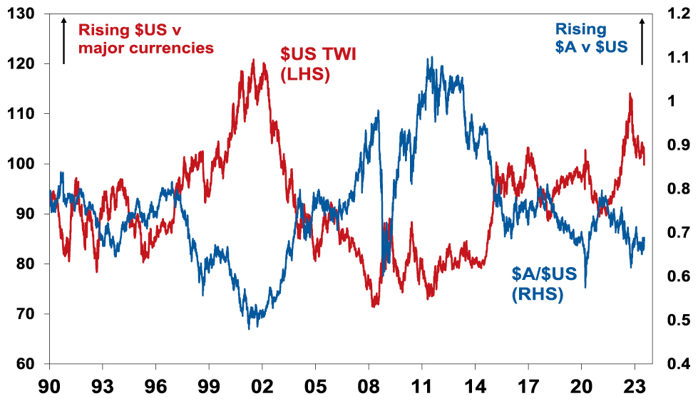 Due to the relatively low exposure of the US economy to cyclical sectors (like manufacturing), the $US tends to be a “risk-off” currency. In other words, it goes up when there are worries about global growth and down when the outlook brightens. An increasing $US is also bad news for those with $US denominated debt in the emerging world. So, moves in it bear close watching as a key bellwether of the investment cycle. Last year the $US surged with safe haven demand in the face of worries about recession, war and aggressive Fed tightening. Since September though it has fallen back as inflation and Fed rate hike fears eased and geopolitical risks receded. And after stalling over the last six months, it’s since broken down again. A further downtrend in the $US would be a positive sign for investment markets this year, whereas a sustained new upswing would suggest they may be vulnerable. So far it’s going in the right direction.