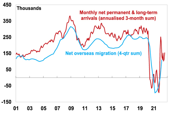 A surge in new visas for arrivals as the backlog is worked through and in monthly data for net permanent and long-term arrivals point to a rebound in immigration levels. Consistent with this the Budget is projecting net immigration of 235,00 from this financial year consistent with pre-pandemic levels. This follows negative net immigration in 2020-21. The surge in immigration will help ease the labour shortage and tight jobs market evident in the first two charts in this note. Which in turn will help head off a surge in wages growth to levels well beyond those consistent with the inflation target.