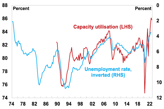 Returning inflation to the 2-3% target is of utmost importance as the 1970s experience highlights that failure to do so will lead to even worse economic conditions and a continuing rough time in investment markets. And the surge in inflation is more than just supply constraints flowing from the pandemic, the war in Ukraine and floods, as demand is running well above supply in the Australian economy. This is evident in very high capacity utilisation rates and very low unemployment (see the next chart).