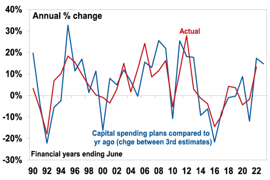 Business investment plans for the year ahead remain strong. The ABS capital spending intentions survey is up about 15% on a year ago. It’s likely this partly reflects the higher costs of investing, but it’s also consistent with high levels of capacity utilisation, reasonable business conditions and confidence, and some easing in supply chain pressures. Real business investment is expected to grow by around 5% over the year ahead.