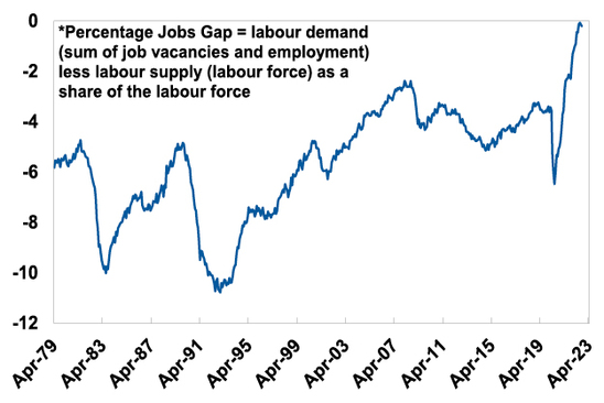 For the labour market its also evident in a high ratio of job vacancies to unemployment. This has meant that the “jobs gap” in Australia (defined as labour demand (as measured by job vacancies plus employment) less labour supply (or the labour force) as a share of the labour force) which has closed to around zero for the first time in over 40 years (see the next two chart). The longer the very tight labour market remains, the greater the chance that wages growth will surge will in excess of the three point something that is consistent with inflation in the 2-3% target range.