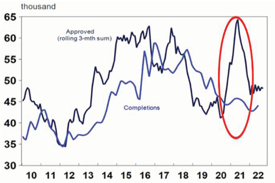 From their high last year, approvals to build new homes in Australia have fallen about 25% reflecting the end of the HomeBuilder grant and rising interest rates. While this points to a downturn in home building, its likely to be cushioned because there is a large pipeline of work yet to be completed with home completions yet to catch up to the surge in home building approvals through the pandemic (see red circled area in the next chart). This has been due to poor weather and shortages of labour and building materials. The large pipeline of work yet to be done will likely provide a floor for home building, preventing a plunge in dwelling investment that would normally flow from a 25% fall in approvals.