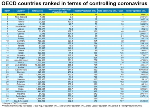 Australia’s success in “controlling” coronavirus continues to stand out globally (touch wood). Comparing OECD countries in how they are managing the coronavirus outbreak (based on new cases per capita, deaths per capita, total cases per capita and testing per capita) Australia ranks first, with NZ 2nd (this has been flipping around) compared to the US at 22nd, Sweden at 28th, Spain at 32nd and France at 36th. See the next table.