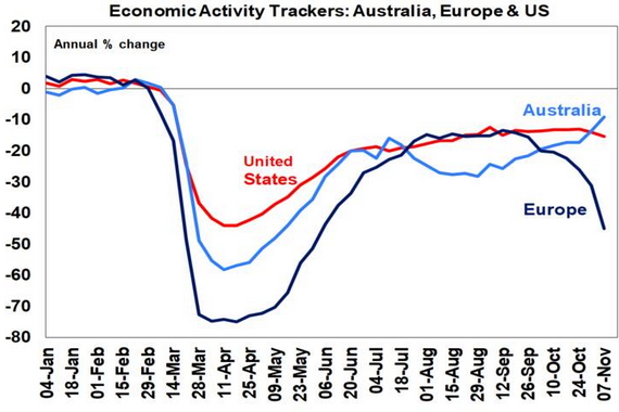 The combination of better virus control, a superior policy response, exposure to faster recovering China and Asia, the shift in mining investment from being a drag to being a boost to the economy and leverage to a cyclical recovery globally should result in a stronger more assured recovery in the Australian economy relative to comparable countries in the year ahead. This is partly evident in our Economic Activity Trackers which are based on weekly data for things like credit card sales, restaurant bookings, job openings, confidence and mobility. While the Victorian lockdown saw Australia’s Economic Activity Tracker fall back around August, it has recently started to accelerate again & is looking stronger than the US and Europe.