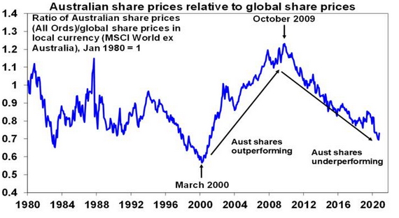 A relatively stronger recovery for the Australian economy should benefit Australian assets relative to global assets. This could continue to come via an appreciation of the $A and we continue to see the $A rising to around $0.80 over the next year or so. However, it’s also likely the relative underperformance of the Australian share market since October 2009 has run its course. The next chart shows the ratio of Australian share prices to global share prices in local currency terms. Over the last 30 years, the relative performance of Australian shares has seen three distinct waves – underperforming through the tech boom until March 2000, outperforming through the resources boom of the 2000s, but underperforming since October 2009 as the mining boom went bust and coronavirus hit cyclical stocks.