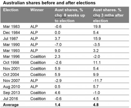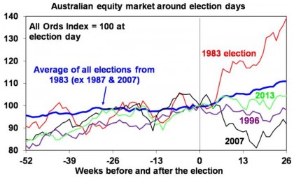 However, the elections resulting in a change of government have seen a mixed picture. Shares rose sharply after the 1983 Labor victory but fell sharply after the 2007 Labor win, with global developments playing a role in both. After the 1996 and 2013 Coalition victories shares were flat to down. So based on historical experience it’s not obvious that a victory by any one party is best for shares in the immediate aftermath, and historically the impact of swings in global shares arguably played a bigger role than the outcomes of federal elections.