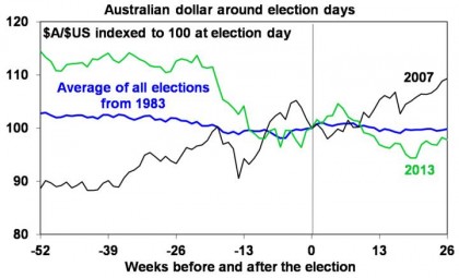 In terms of the share market, there is some evidence of it tracking sideways in the run up to elections, which may be because investors don’t like the uncertainty associated with the prospect of a change in policies. The next chart shows Australian share prices from one year prior to six months after federal elections since 1983. This is shown as an average for all elections (but excludes the 1987 and 2007 elections given the global share crash in late 1987 and the start of the global financial crisis (GFC) in 2007), and the periods around the 1983 and 2007 elections, which saw a change of government to Labor, and the 1996 and 2013 elections, which saw a change of government to the Coalition. The chart suggests some evidence of a period of flat lining in the run up to elections, possibly reflecting investor uncertainty, followed by a relief rally.