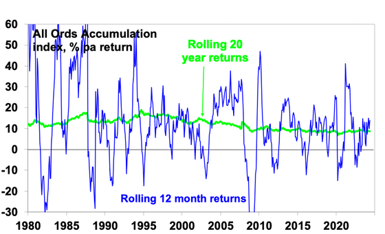 Usually the grander the forecast – calls for “great booms” or “great crashes” – the greater the need for scepticism as such calls invariably get the timing wrong (so you lose before it comes right) or are dead wrong. Market prognosticators suffer from the same psychological biases as everyone. If getting markets right were easy, prognosticators would be mega rich and would have stopped long ago. Related to this, many get it wrong by letting blind faith – “there is too much debt”, “house prices are too high” – get in the way of good decisions. They may be right one day, but an investor can lose a lot of money in the interim. The problem for ordinary investors is that it’s not getting easier. The world is getting noisier with the rise of social media which has seen the flow of information & opinion go from a trickle to a flood and the prognosticators get shriller to get clicks. Even when you do it right as an investor, a lot of the time you will be wrong – just like Roger Federer who noted that while he won almost 80% of the 1526 singles matches in his career, he won only 54% of the points, or just over half. It’s unlikely to be much better for great investors. For most investors its best to focus on the long term trend in returns – ie, the green line as opposed to the blue line in the first chart.