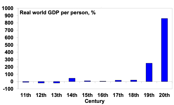 This really took off in the 20th century as technological innovations such as electricity, the internal combustion engine and silicon chips came together to rapidly boost productivity. Consequently, real income or Gross Domestic Product (GDP) per person surged globally. This in turn led to a massive rise in material prosperity with, eg: large climate-controlled homes; high speed affordable travel; high quality & variety of food; a huge array of goods; a massive increase in lifespan, and instant communication & entertainment.