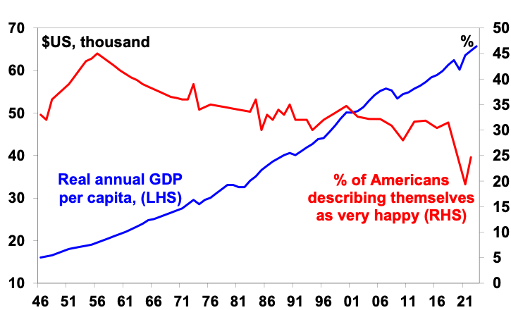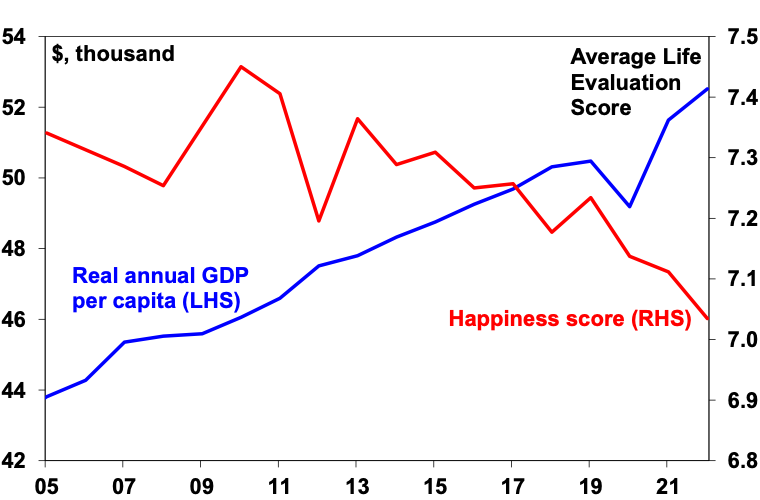 It’s a similar picture for Australia, although we only have Australian happiness data (from the World Happiness Report) for the last 20 years.