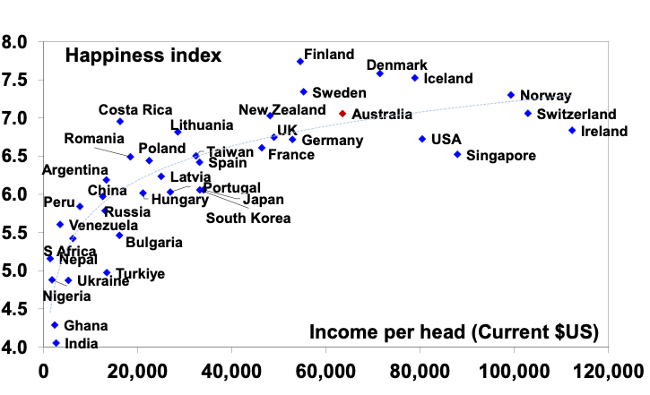 This is not to say that happiness is not high in rich countries. In fact, according to the World Happiness Report for 2024 Finland ranks #1 as the most happy and Australia ranks #10 with the US at #23. Lebanon and Afghanistan rank at the bottom at #142 and #143. It’s just that in rich countries variations in income across countries have little impact on happiness. Other findings from the happiness studies are as follows: