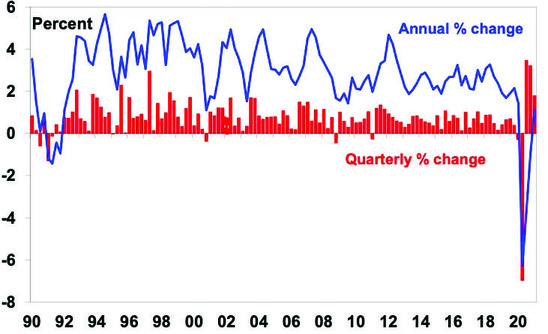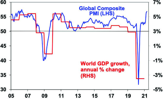 We expect GDP growth through this year of 5% and 3.5% next year. This in turn should underpin an ongoing rebound in corporate profits which, along with continuing low interest rates, will underpin a still rising trend in the Australian share market – notwithstanding the risk of a correction in the next few months. Key risks to keep an eye on are: coronavirus outbreaks; a likely further near term inflation scare; and tensions with China.