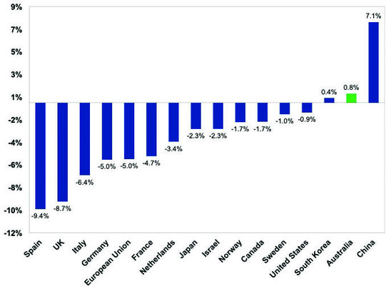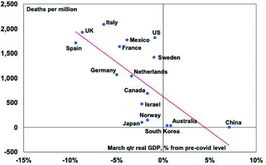 This reflects a combination of better control of coronavirus – which meant lower hospitalisations and deaths, less severe lockdowns and less self-regulation limiting mobility – and a good well-targeted policy response that protected incomes, jobs and businesses. Countries with less coronavirus related deaths like Australia have had better GDP outcomes.