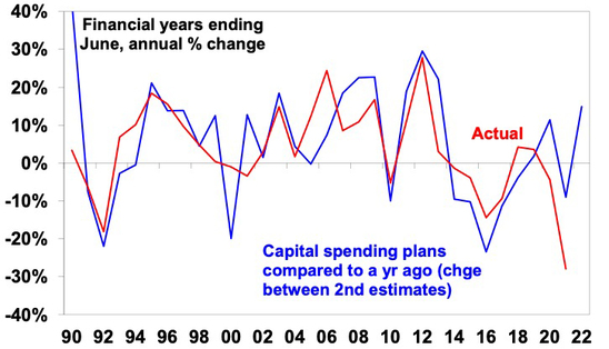 Fifth, business investment is strengthening – investment plans for the next financial year are up nearly 15% on plans for a year ago which is consistent with high levels of business confidence, excess corporate cash and the instant asset write-off tax break. Adjusting business intentions for the past average gap between intentions and actual outcomes points to investment growth of around 20% in the next financial year with mining investment the strongest but manufacturing and other industries also strong.