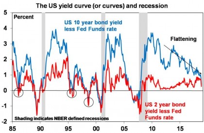• Monetary conditions are still not tight in the US and they are still very easy globally. While there has been much fretting about the US yield curve flattening and in some cases inverting (with long term bond yields falling below short-term interest rates) the two yield curves we have found most reliable are still positive albeit less so. The gap between the 10-year bond yield and the Fed Funds rate has flattened dramatically but is still positive at 39 basis points. And the gap between 2-year bond yields and the Fed Funds rate has also flattened a lot but is still positive. As can be seen in the next chart, prior to the last three US recessions both of these yield curves inverted – but there were several false signals and the gap between the initial inversion and recession can be around 15 months. So even if they both invert now recession may not occur until 2020 and yet historically share markets only precede recessions by around 3-6 months so it would be too far away for markets to anticipate. And past recessions in the US have also been preceded by the Fed Funds rate being well above inflation and nominal growth and it’s a long way from that.