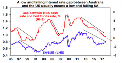 The main relevance of ongoing US monetary tightening is that it will serve to keep the $A down, notwithstanding the risks of a short term bounce higher in the $A. With the RBA on hold and the Fed set to continue raising rates, by March next year the Fed Funds rate will likely exceed the RBA’s cash rate with the interest rate differential set to further deteriorate against Australia through next year. If history is any guide, this is likely to see downwards pressure on the $A. We see the $A falling to around $US0.70 by end 2018 after its surprise strength in 2017.