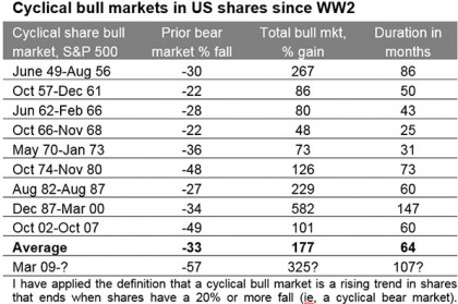 A typical cyclical bull market in shares has three phases: scepticism – when economic conditions are weak and confidence is poor, but smart investors see value in shares helped by ultra-easy monetary conditions; optimism or the “sweet spot” – when profits and growth strengthen and investor scepticism gives way to optimism while monetary policy is still easy; euphoria – when investors become euphoric on strong economic and profit conditions, which pushes shares into clear overvalued territory and excesses appear, forcing central banks to become tight triggering an economic downturn, which combines with overvaluation and investors being fully invested to drive a new bear market.
