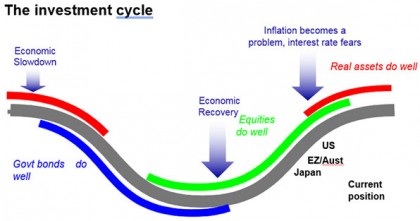 Typically, the bull phase lasts five years. However, “bull markets do not die of old age but of exhaustion” – their length depends on how quickly recovery proceeds, excess builds up, inflation rises and extremes of overvaluation and investor euphoria appear.