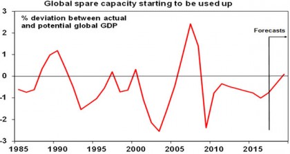 However, this is starting to change. Global growth forecasts have stopped being revised down and are now being revised up. Global growth this year and next will likely be around 3.9% which is above potential. So global spare capacity is starting to be used up.