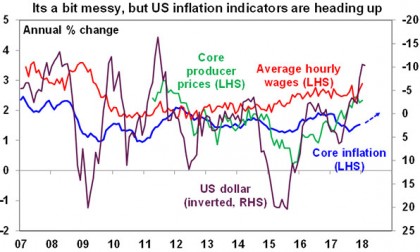 Fiscal austerity has given way to fiscal stimulus – at least in the US (with tax cuts and the removal of spending caps) – which with a lag will further boost growth. Inflationary pressures are building in the US – which is further advanced in the economic cycle than Europe, Australia and Japan (see the first chart) – with a tight labour market, rising wages growth and accelerating import prices (flowing from the falling $US) and producer price inflation.
