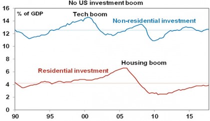while investment is starting to pick up globally, there is no sign of overinvestment. While the US is further advanced, even here business investment (excesses in which preceded the tech wreck) and residential property investment (excesses in which preceded the GFC) are around their long-term averages relative to GDP.