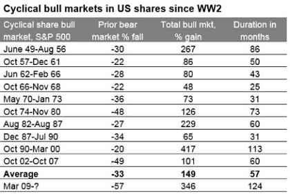 Data is for the S&P 500. A cyclical bull market is defined as a rising trend in shares that ends when shares have a 20% or more fall. It could be argued that the 20% fall in July to October 1990 was not really a bear market as it was too short & shares surpassed their prior highs within a year. If it was not really a bear then the latest bull market becomes the second longest. Source: Bloomberg, AMP Capital.