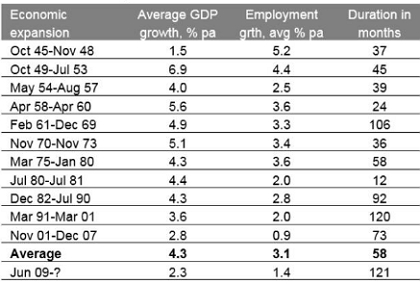 The cyclical bull market in US shares is now over ten years old. This makes it the longest since WW2 and the second strongest in terms of percentage gain. And according to the US National Bureau of Economic Research the current US economic expansion that started in June 2009 is now 121 months old and compares to an average expansion of 58 months since 1945. This makes it the longest on record (since 1854). See the next two tables. But it’s noteworthy that it’s not the strongest. In fact, GDP and employment growth through this expansion have averaged around half that seen in the average post war expansion. Both have been the second weakest.